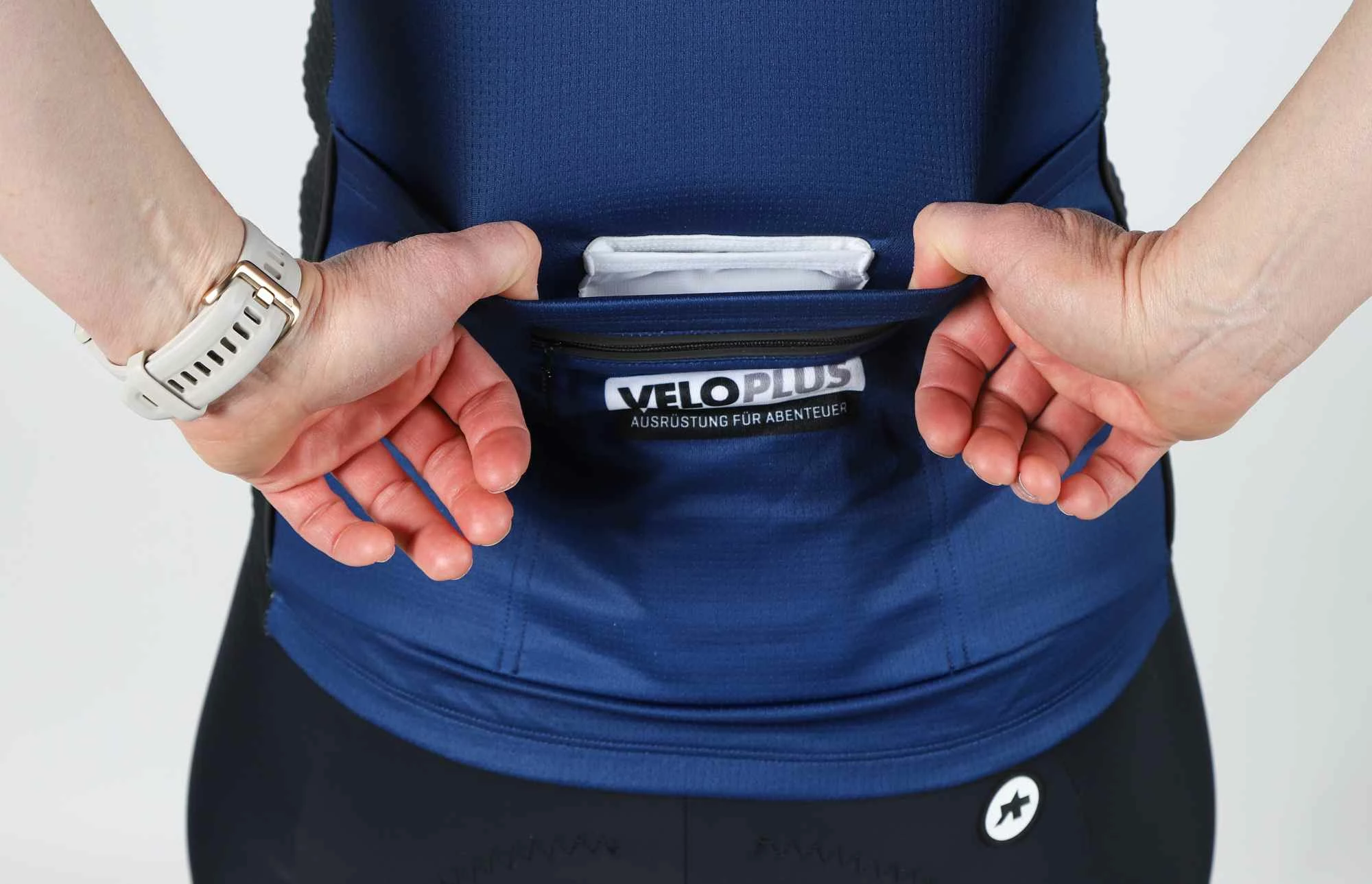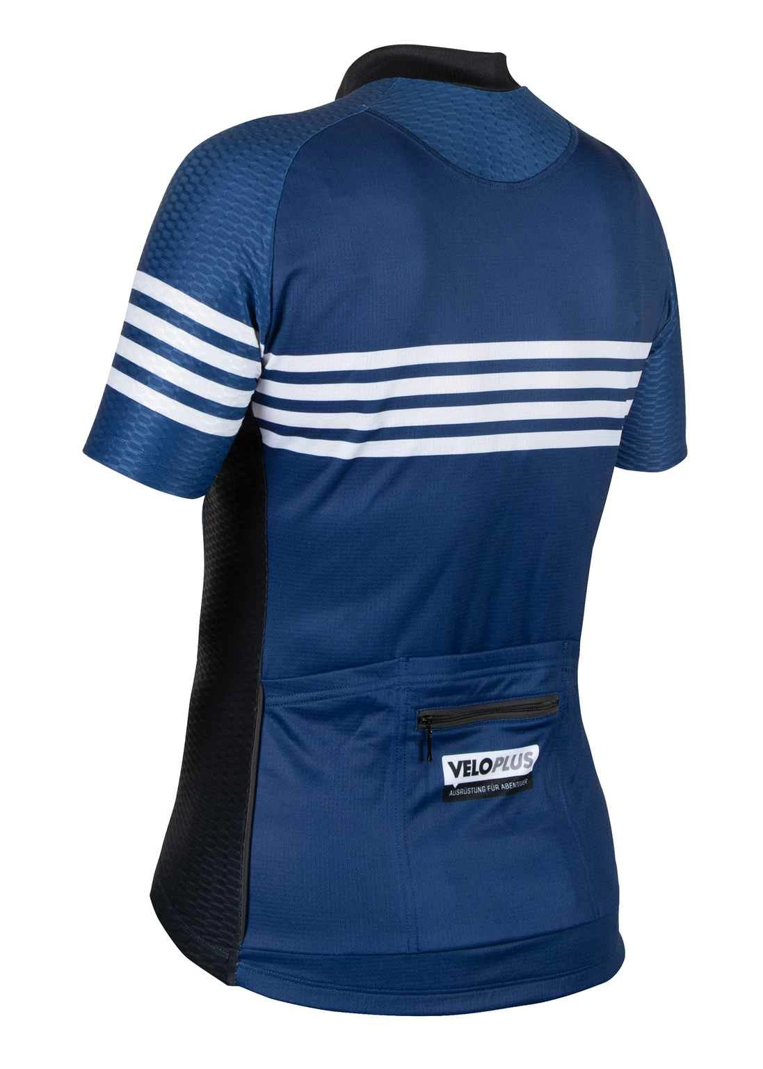 Das Oberteil ist anliegend und auf die Veloposition geschnitten – jedoch ohne einzuengen –, sondern gewährt im Gegenteil volle Bewegungsfreiheit. Das Material ist leicht, sehr atmungsaktiv und trocknet schnell, wodurch es sich kaum je nass anfühlt. Mesh-Einsätze auf der Seite sorgen für die nötige Ventilation und optimales Klimamanagement Der durchgehende Frontreissverschluss erleichtert das An- und Ausziehen und kann während der Fahrt als zusätzliche Ventilation eingesetzt werden. Der Saum ist im Rückenbereich mit Silikon versehen, damit nichts rutscht. Das Oberteil verfügt über eine dreiteilige Rücken-, eine Reissverschluss- und eine Handytasche. Reflektierende Elemente sorgen für Sichtbarkeit.