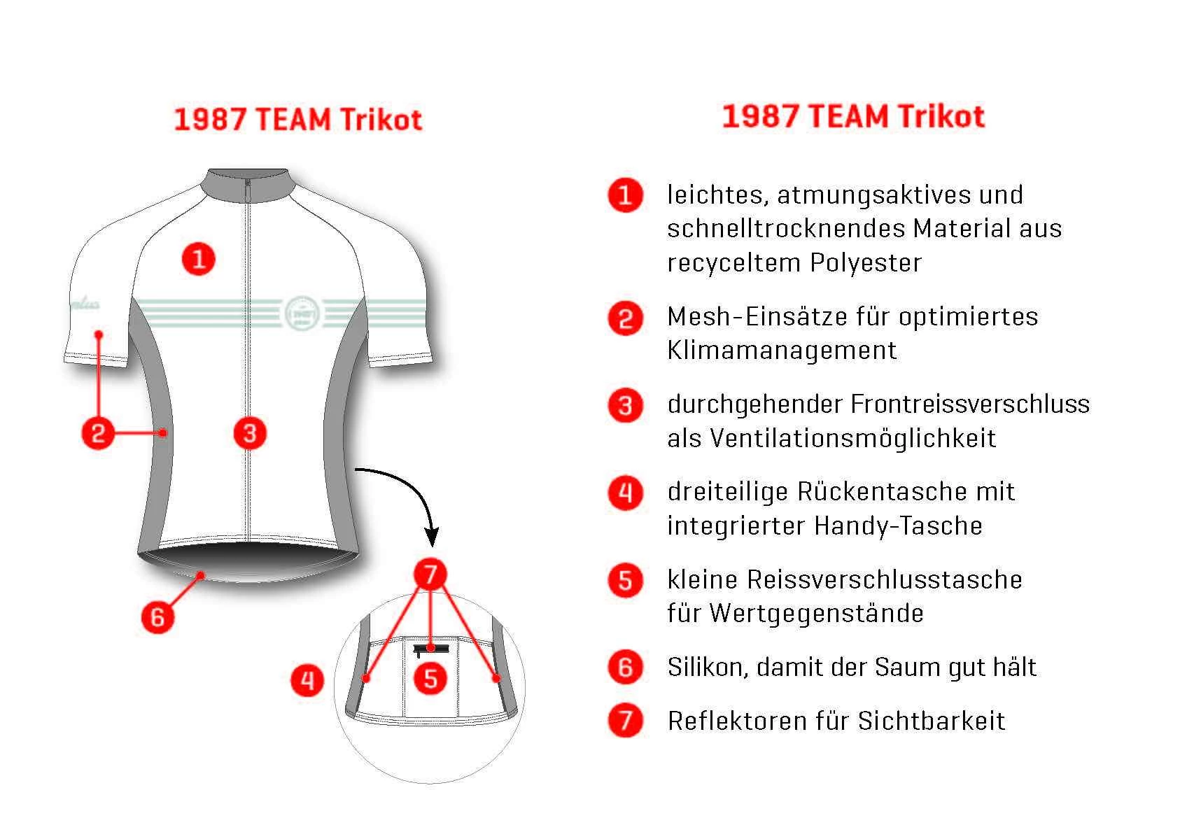 Mit mehreren Umfragen wurden die Vorlieben von Kund:innen und Mitarbeiter:innen in Sachen Schnitt, Eigenschaften und Design abgeholt. Aus den vielen Rückmeldungen entstand das neue 1987 TEAM Trikot.