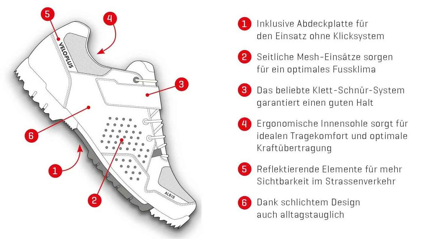 Seitliche Mesh-Einsätze sorgen für optimale Belüftung und ein angenehmes Fussklima. Dank schlichtem Design und Turnschuh-Feeling eignet sich der ALBIS 2.0 für den Einsatz in der Freizeit und im Alltag. Mit den mitgelieferten Abdeckplatten können die Schuhe sowohl für Click- als auch für Plattform-Pedalen verwendet werden. Benannt nach der Bergkette Albis, das stadtnahe Erholungsgebiet im Kanton Zürich, ist er der ALBIS 2.0 der ideale Veloschuh für Freizeit-, Touren- und Genussfahrer.