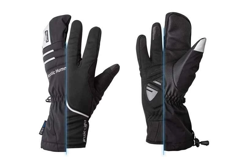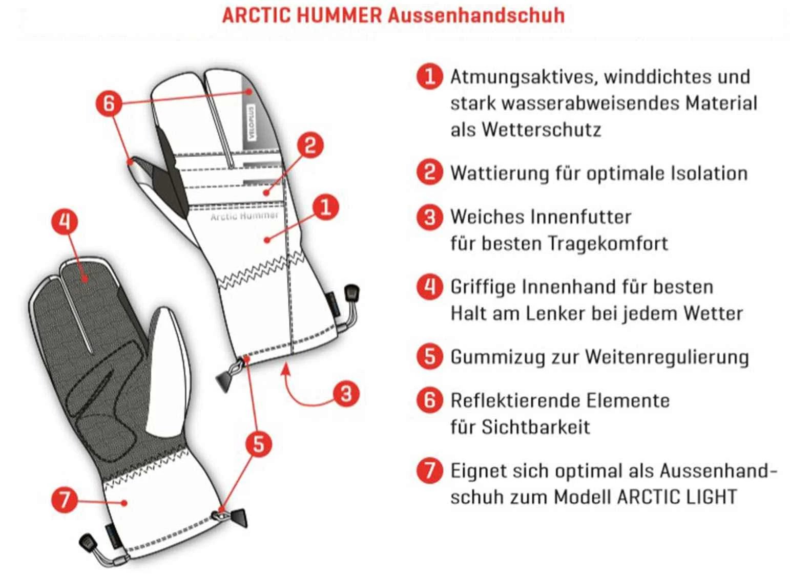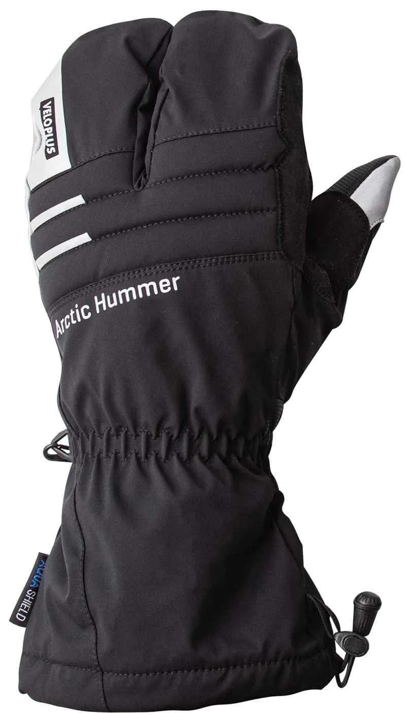Beim stark wasserabweisenden, weit übers Handgelenk reichenden Aussenhandschuh ARCTIC HUMMER 2.0 von VELOPLUS sind je zwei Finger zusammengefasst. So wird die Wärmeabstrahlung minimiert und die Greiffähigkeit bleibt trotzdem erhalten. Gummizug zur Weitenregulierung. Der Handschuh kann über einen Fleece- oder Softshell-Handschuh gezogen werden. Besonders gut eignet sich dafür der winddichte Softshell-Innenhandschuh ARCTIC LIGHT von VELOPLUS. Reflektierende Elemente. (PK)