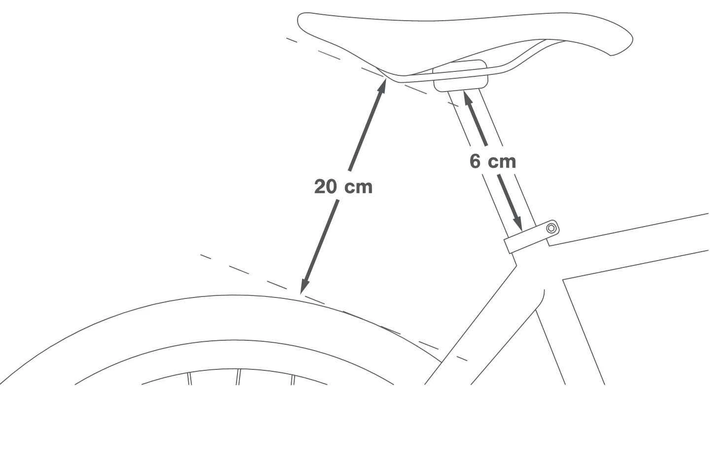 - Der Abstand vom Sattelrohr zur Sattelklemme muss min. 6 cm betragen. Der Abstand von den Sattelstreben zum obersten Punkt des Reifens muss min. 20 cm betragen. Bei Fullsuspension-Bikes sind diese Masse zu messen, wenn der Dämpfer voll eingefedert ist.