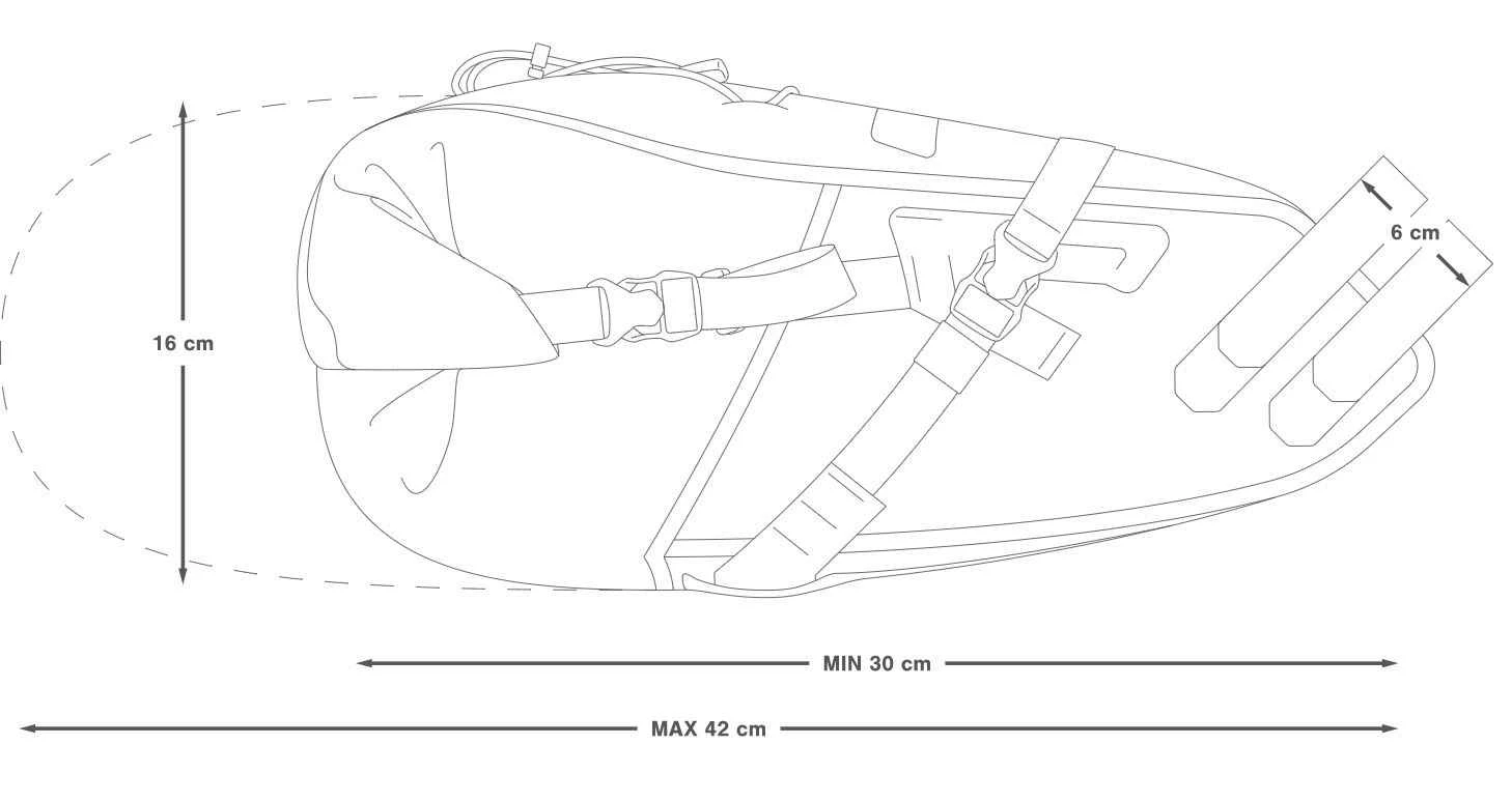 - Soll die Satteltasche an einem Bike mit absenkbarer Sattelstütze montiert werden, muss die Sattelstütze auf ihr Minimum eingefahren werden, um die Masse für die Kompatibilität (s.o.) zu prüfen. Montage nur in Kombination mit DROPPER POST ADAPTER, s.u..