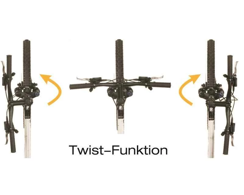 Wer kennt das nicht: Der Veloständer beim Bahnhof ist prall gefüllt. Nur mit Mühe bringt man sein Velo in die letzte freie Lücke und dabei verhackt sich der Lenker mit dem Schaltkabel des Nachbar-Velos! Mit dem STEM TWIST von Speedlifter ist Schluss damit! Mit einfacher und werkzeugfreier Bedienung lässt sich dieser Vorbau um 90° nach links oder rechts drehen. Und das in Sekundenschnelle: Schnellspannhebel öffnen, Sicherheits-Arretierungsbolzen eindrücken und der Lenker kann schon gedreht werden. Auch ideal für platzsparenden Transport der Velos auf Auto-Trägern. (RC)