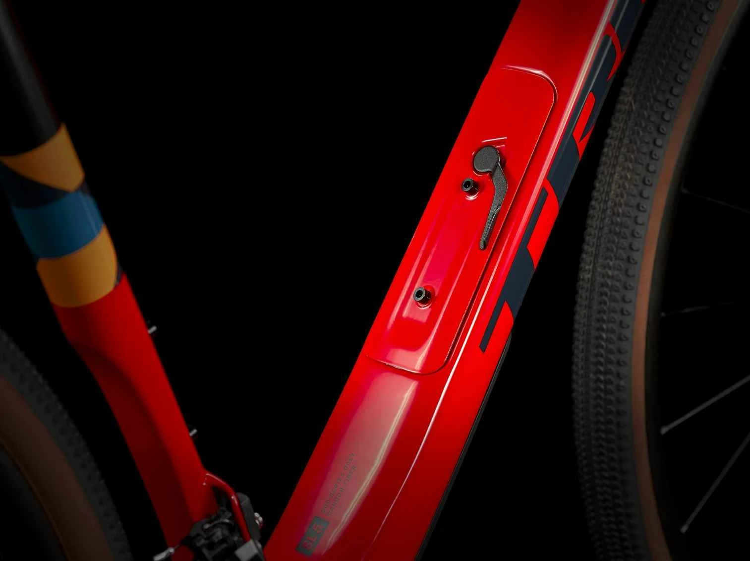 Ein Satteltäschchen fürs Flickzeug brauchst du nicht mehr, denn das schlanke, im Rahmen integrierte Staufach ermöglicht die Unterbringung eines Ersatzschlauchs und Werkzeug.