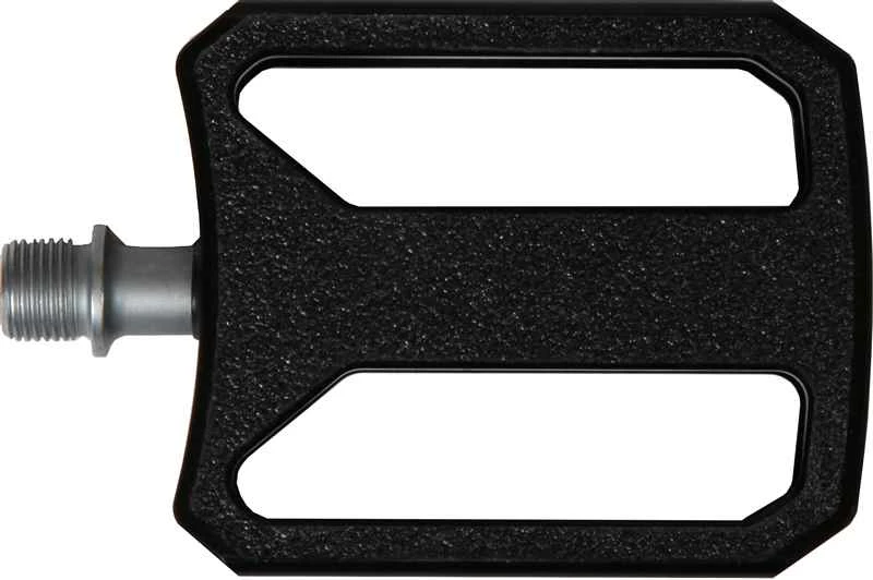 Die grosse Aufstandsfläche des CNC-gefrästen Aluminium Pedalkörpers hat ein flaches Profil, um einen unangenehmen Stand bei dünnen Alltags-Schuhsohlen zu verhindern. Zudem werden Ledersohlen dank profillosem Design geschont.