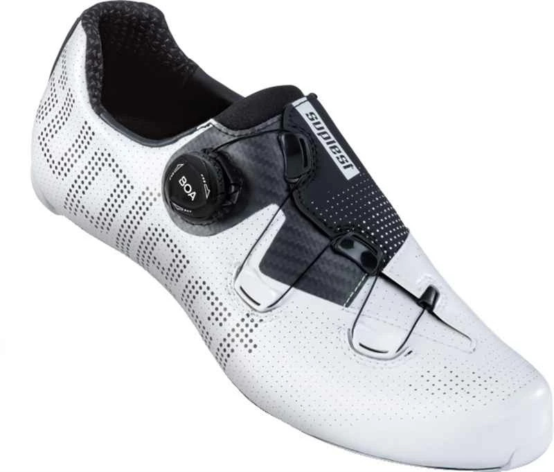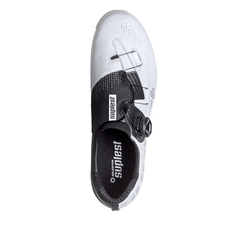 Der neue Rennveloschuh der Schweizer Marke Suplest ist noch leichter und steifer geworden. Die steife Carbonsohle ermöglicht explosives Beschleunigen. Die ergonomische Innensohle von Solestar garantiert beste Kraftübertragung und höchsten Komfort. Das geniale BOA-Drehverschlusssystem ermöglicht millimetergenaues Anpassen ohne Druckstellen. Die Wrap-Zungenkonstruktion wird verschiedensten Fussformen und -breiten gerecht. Das Obermaterial des Rennveloschuhs besteht aus extrem leichtem und nahtlosem Microfiber-Material und ermöglicht eine optimale Kombination von Atmungsaktivität, Tragekomfort und Halt. 470g/Paar. (VN)