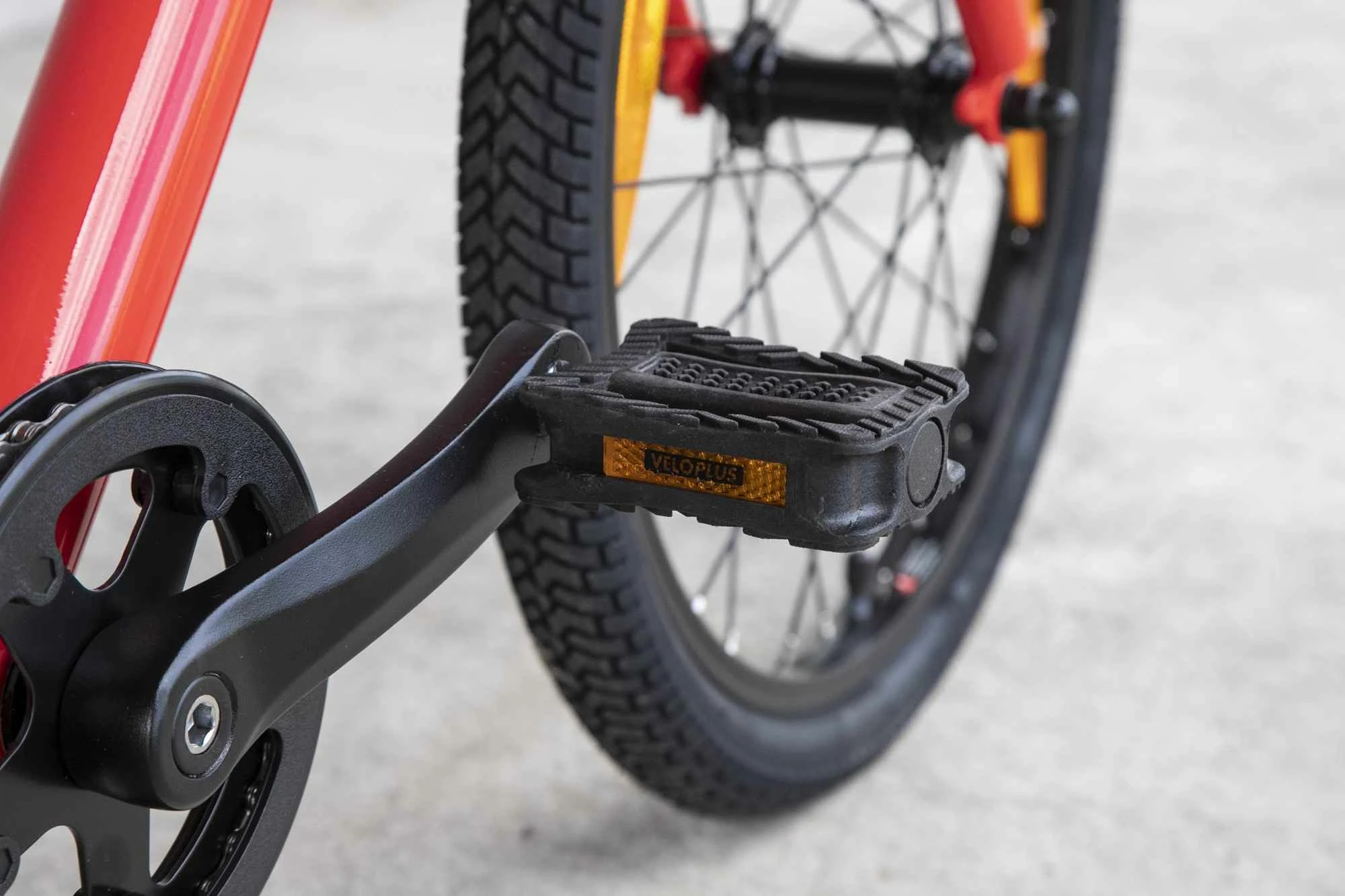 Mit mehreren Komponenten haben wir das Velo sicherer gemacht: Die Bremsenhebel und Bremsen sind auf die Handgrösse und Kraft des Kindes ausgerichtet, die Griffe sind abrutschsicher und das kleinere, nach aussen verjüngte Pedal verhindert ein Aufstehen am Boden beim Kurvenfahren.
