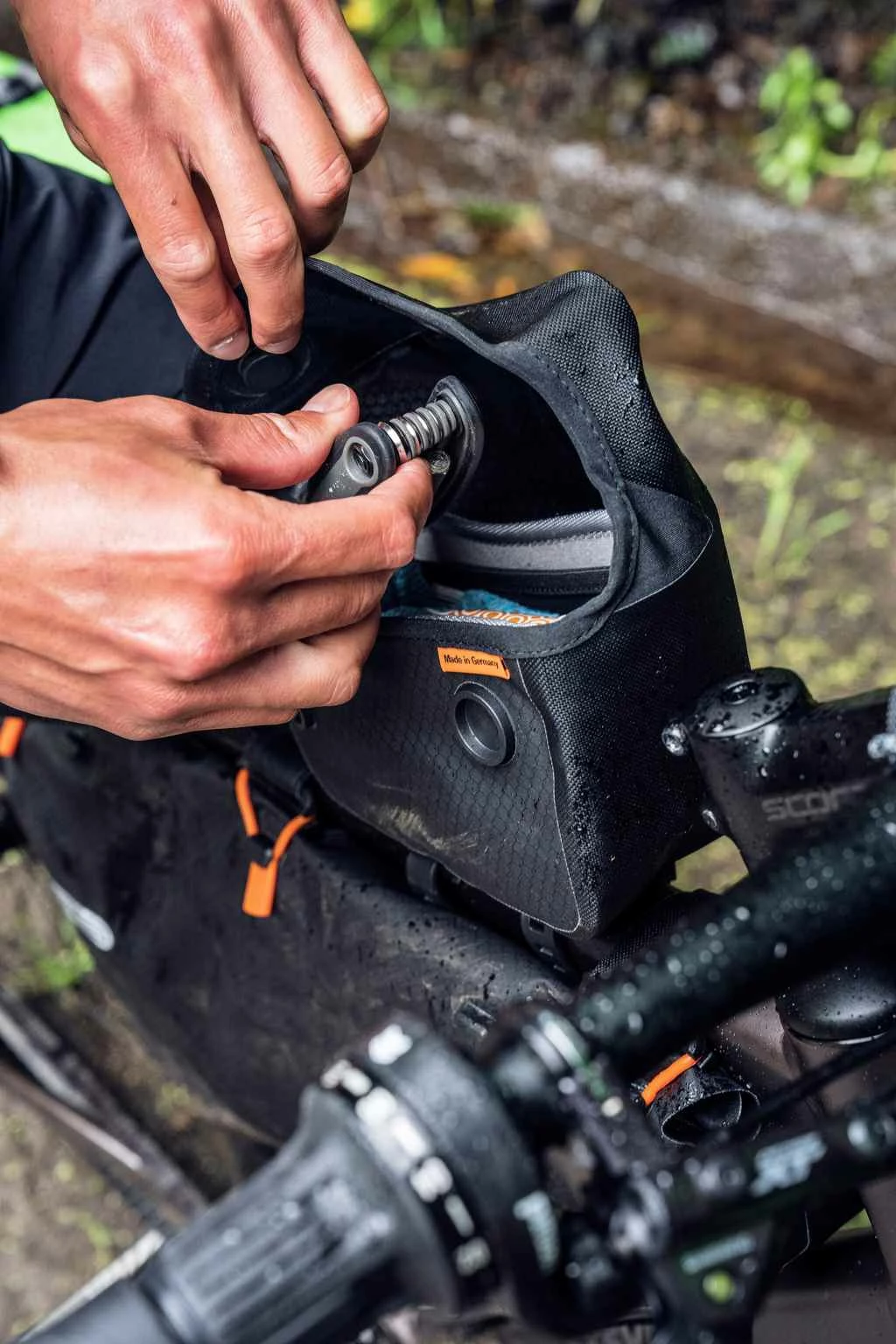 Kompakte Oberrohrtasche mit praktischem Magnetdeckel für Schnellzugriff auf Snacks & Co.