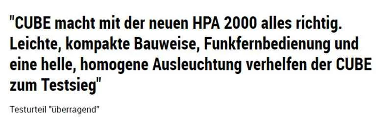 “CUBE macht mit der neuen HPA 2000 alles richtig. Leichte, kompakte Bauweise, Funkfernbedienung und eine helle, homogene Ausleuchtung verhelfen der CUBE zum Testsieg.”