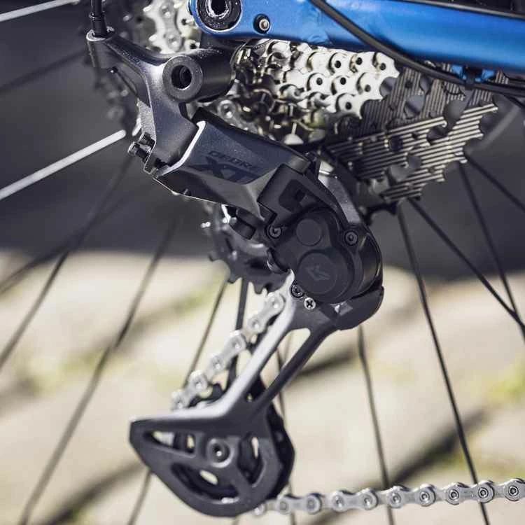 Der LINKGLIDE XT RD-M8130 1x11fach-Wechsel ist ausschliesslich mit den entsprechenden LINKGLIDE Komponenten (Kassette und Schalthebel) einsetzbar, die speziell für die hohen E-Bike-Drehmomente entwickelt wurden. Gegenüber bisherigen 11fach-Wechseln mit erweitertem Schaltkapazität für LINKGLIDE Kassette 11-50 Zähne, so werden auch die steilsten Anstiege befahrbar. Der per Hebel zuschaltbare Ketttenstabilisator (auf Bild nicht ersichtlich) erhöht auf rauem Untergrund die Kettenstabilität, was ein Abspringen der Kette verhindert. (J)