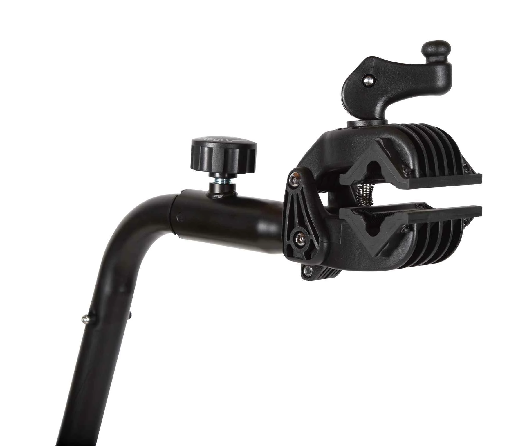 Die Halteklaue aus faserverstärktem Kunststoff lässt sich über den Exzenter-Hebel weit öffnen, so lässt sich das Velo schnell und einfach fixieren. Das Velo lässt sich in 5 Positionen fixieren. Der Verstellwinkel von Position zu Position beträgt somit 72°.