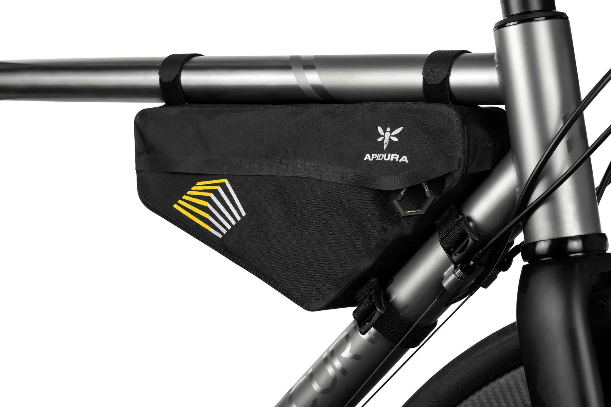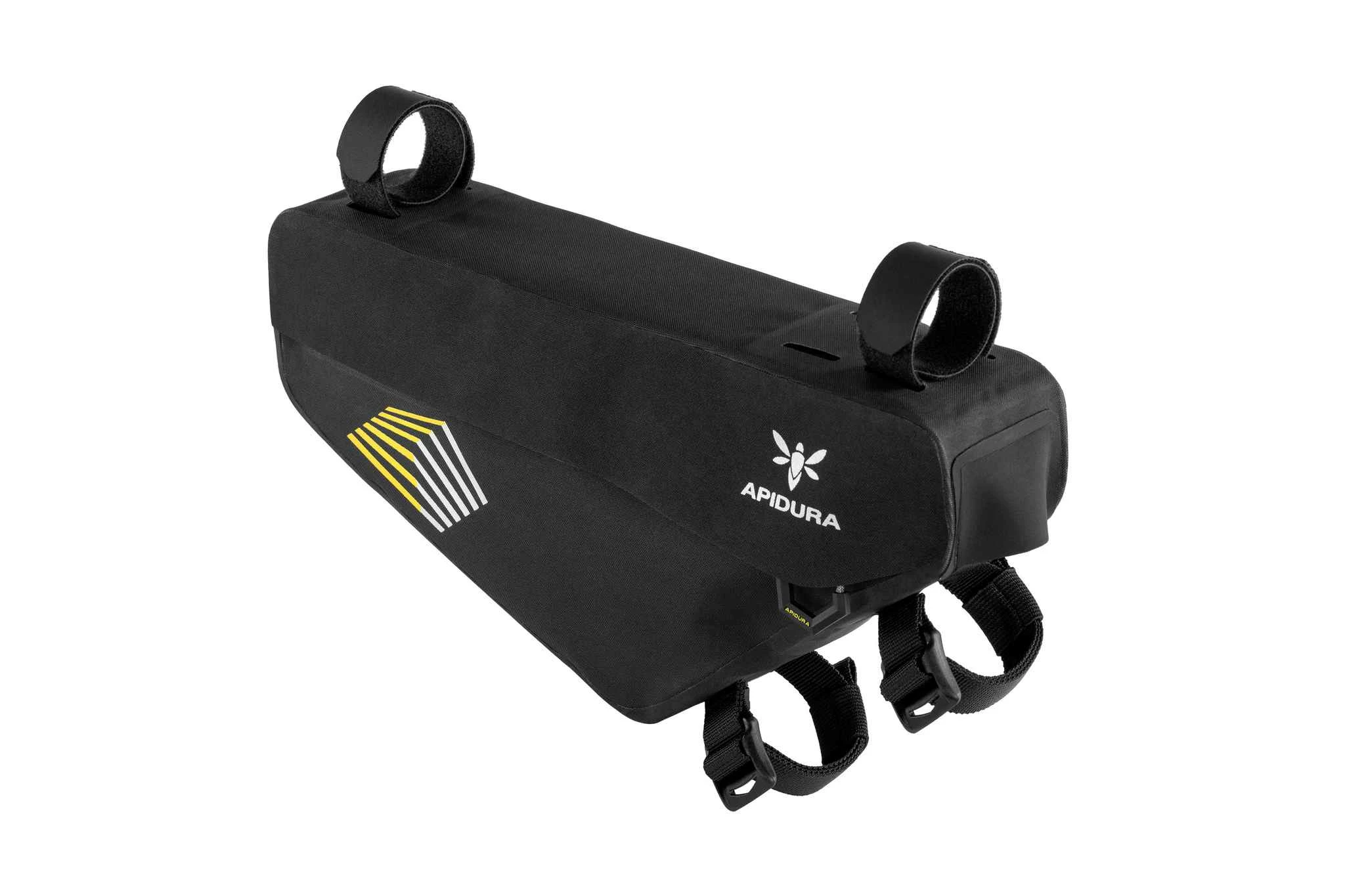 Die RACING FRAME PACK Rahmentasche von APIDURA eignet sich mit ihrer zentralen Position am Velo für das Verstauen von schwereren Gegenständen, z.B. Werkzeug oder Powerbank auf längeren Distanzen. Da das Gewicht hier zentral am Velo ist, lassen sich schwerere Gegenstände gut transportieren und haben einen geringeren Einfluss auf das Fahrverhalten. Für einen guten Sitz im Rahmendreieck wird die Tasche an zwei Seiten mit Straps befestigt. Die 3 Velcro-Straps, die die Tasche am Oberrohr fixieren, lassen sich flexibel positionieren und ermöglichen so die Kompatibilität mit Oberrohrtaschen. Die Tasche wurde so designt, dass Bidonhalter und Bidon im Rahmendreieck ebenfalls Platz finden.