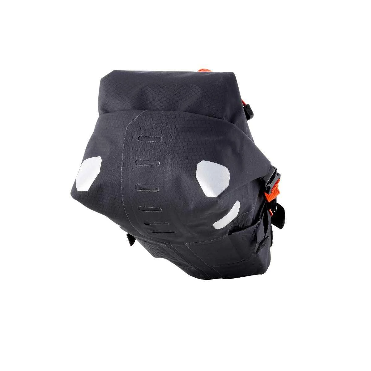 Die Bikepacking-Tasche von ORTLIEB ist, wie man es von ORTLIEB kennt, 100 % wasserdicht. Mit einem robusten Klettverschluss um die Sattelstütze, zwei Riemen um die Sattelstreben und verstärktem Gewebe an Kontaktstellen zum Sattel kann die Tasche auch auf sehr ruppigen Gelände verwendet werden. Ein zusätzliches Ventil sorgt für schnelle und einfache Kompression. Auf der Rückseite befinden sich mehrere Rücklicht-Schlaufen. Verschiedene Reflektoren erhöhen die Sichtbarkeit. 40 x 15 x 26cm. 11L. 345g.(D)