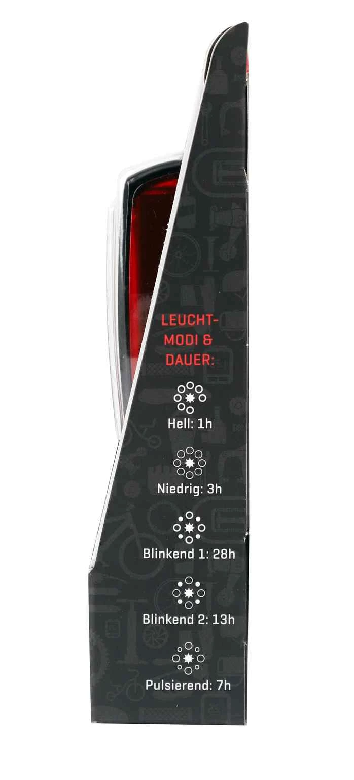5 Verschiedene Modi. Dank Modus-Speicherung schaltet das Rücklicht im zuletzt gewählten Modus wieder ein. Das Rücklicht passt mit dem mitgelieferten Zubehör an sämtliche Sattelstützen (auch an Aerostützen) und wird mittels Gummiband fixiert.