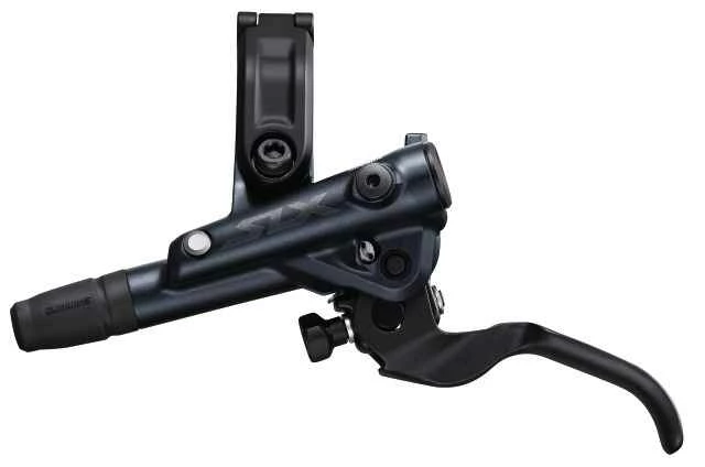 SLX Bremshebel mit werkzeugloser Hebelweitenverstellung. Neben der Befestigungsbride sorgt die zustätzliche Abstützung am Lenker für Steifigkeit, die für den satten Druckpunkt mitverantwortlich ist. (J)