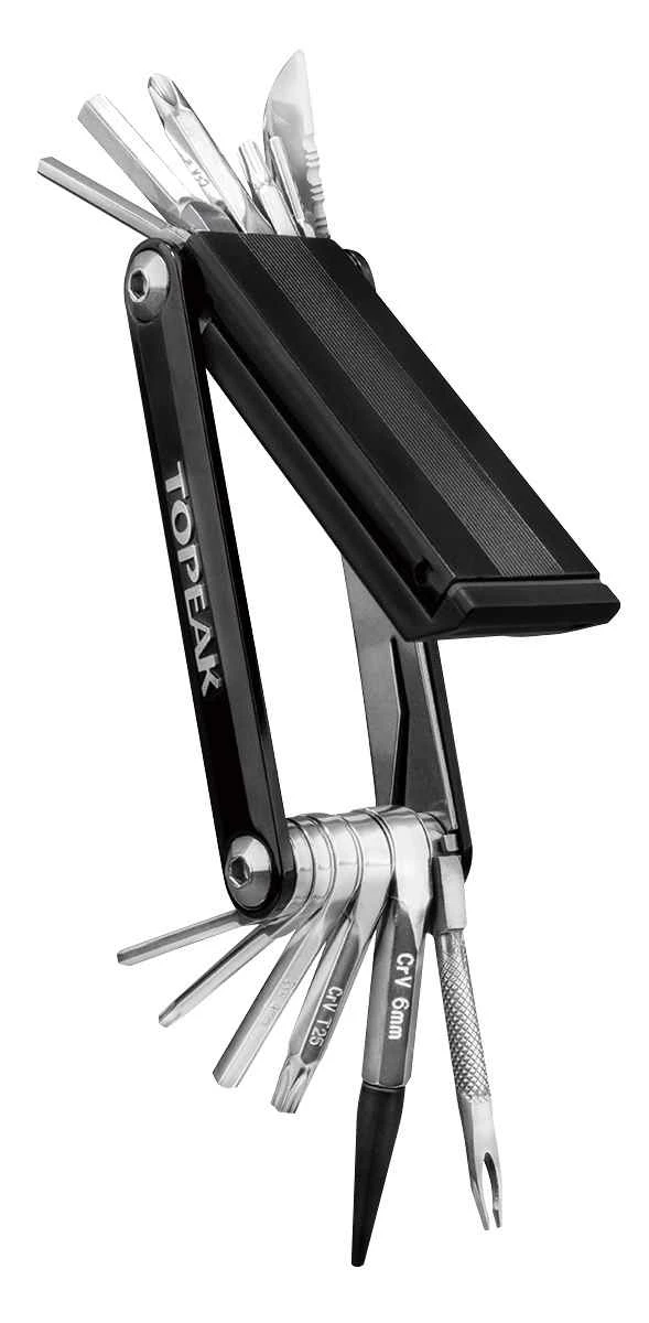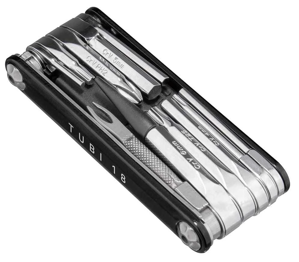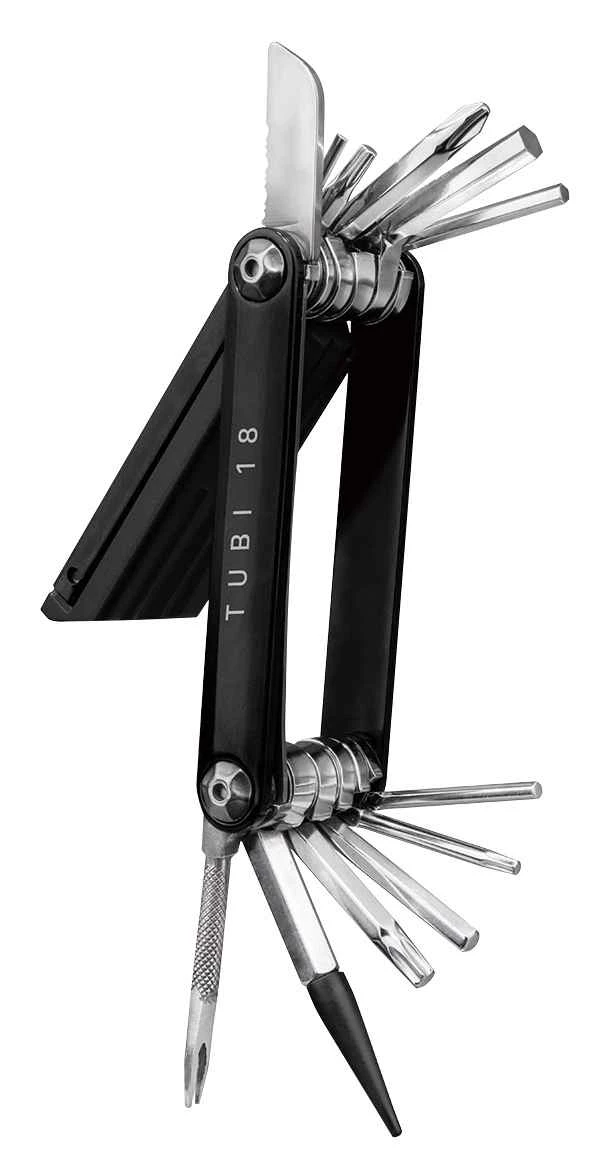 Das TUBI 18 vereint in einem praktischen Multitool alles was es braucht, um unterwegs einen platten Tubeless-Reifen abzudichten und die an Bikes am häufigsten vorkommenden Inbus- und Torx-Schrauben zu bedienen. Tools aus Stahl, Werkzeugkörper aus Alu. Tubeless-Tools: Air-Stop mit Abdeckung, Gabel für Reifenplug, zum Lochaufweiten gerändelt, Messer mit Feststellfunktion um Plug zu kürzen. (RC)