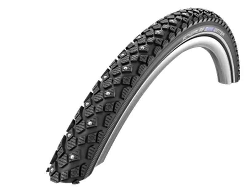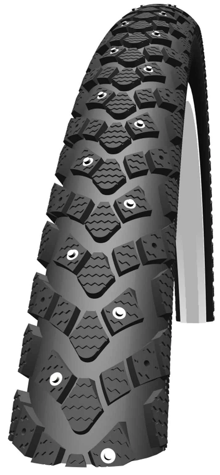 Der Winter-Einsteiger zum günstigen Preis. Der WINTER ist der ideale Reifen für gelegentliche Fahrten auf winterlichen Strassen. Dank der seitlich angeordneten 100 bzw. 120 Spikes minimieren sich die metallischen Rollgeräusche auf ein ertragbares Minimum, vor allem wenn man den Reifen auf den maximalen Druck von 5 Bar pumpt. Für mehr Grip auf Schnee wird der Druck auf 2 Bar reduziert. Reflexstreifen für gute Visibilität und eine «K-Guard»-Pannschutzeinlage gegen Plattfüsse machen den WINTER zum guten Alltagsreifen in der kalten Jahreszeit. Drahtreifen (RI)