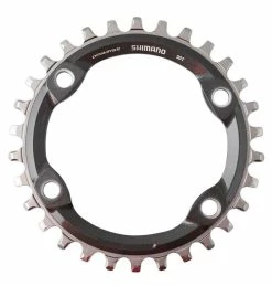 Konstruktion mit Zähnen aus langlebigem Stahl und einem leichten Träger aus Carbon-Verbundwerkstoff. Die Montage erfolgt auf den 4arm-Spiderarm mit LochkreisØ 96mm. Lochkreisbedingt sind keine kleineren Kettenblätter als mit 30 Zähne erhältlich. (J)